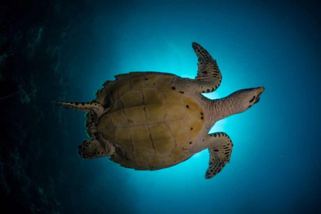 Die Riffe fallen oft senkrecht auf über 200 Meter Tiefe ab. Diese Wände sind überzogen mit riesigen Schwämmen, Gorgonien und Hartkorallen. Bunaken ist berühmt für seine enorme Population an Grünen Meeresschildkröten. Es ist keine Seltenheit, bei einem einzigen Tauchgang 10 bis 15 dieser friedlichen Riesen zu sehen. In den Strömungen an den Riffkanten tummeln sich Schwärme von Füsilieren, Pyramiden-Falterfischen sowie Riffhaie und gelegentlich Adlerrochen oder vorbeiziehende Delfine.
