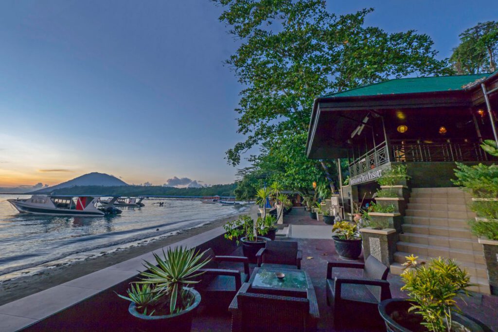 Das Bastianos Bunaken Dive Resort besticht durch seine privilegierte Lage direkt am weitläufigen Liang Beach und ist terrassenförmig in die tropische Hügellandschaft der Insel eingebettet. Die Anlage verbindet authentischen Insel-Stil mit modernen Annehmlichkeiten für Taucher und Erholungssuchende. Der großzügige Pool bildet das visuelle Zentrum. Er liegt erhöht und bietet einen Panoramablick auf das Meer – ideal, um nach den Tauchgängen den Sonnenuntergang zu genießen. Abseits der Tauchaktivitäten bietet das Resort ein kleines Spa, in dem traditionelle indonesische Massagen und Behandlungen zur Regeneration angeboten werden.
