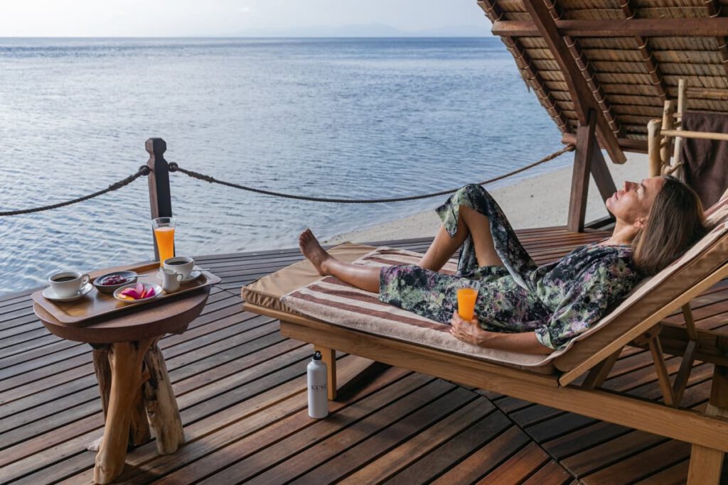 Der Entspannungsbereich unseres Restaurants ist den ganzen Tag über für Sie geöffnet. Hier finden Sie gemütliche Sofas und Kaffeetische, die alle von Hand mit nachhaltigen Materialien gefertigt wurden. Es ist der ideale Ort um eine Tasse Kaffee, Tee oder einen erfrischenden Cocktail zu genießen während sie auf das Meer blicken und die kleinen vorbeischwimmenden Schwarzspitzenriffhaie bewundern können.