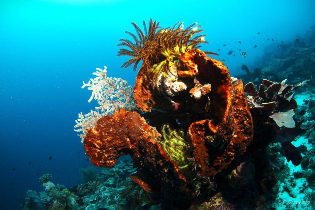 Getaucht wird entweder direkt am sensationellen Hausriff oder bei den Halb- oder Ganztagestouren mit dem Boot. Das Hausriff, eine lang gezogene Steilwand, bietet von Makro über Schwarmfisch bis hin zu phantastischem Bewuchs allerhand abwechslung. Mit den zur Verfügung stehenden Booten kann man sich absetzen und wieder aufsammeln lassen.